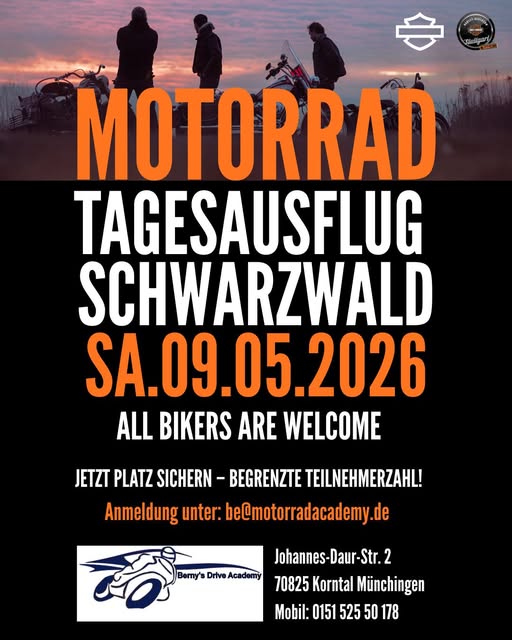 Dann melde Dich am besten sofort an zur Schwarzwald Ausfahrt am 15.6.2024. Die Plätze sind limitiert, also sofort über das Kontaktformular von Harley-Davidson Stuttgart anmelden. Dein Harley-Davidson Team Stuttgart aus Korntal wird Dich dann umgehend kontaktieren.